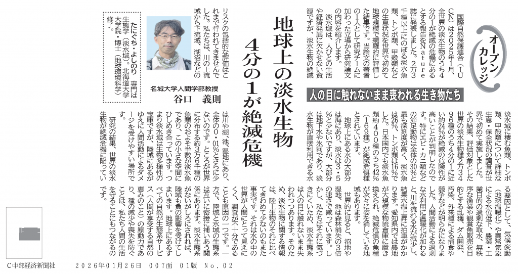 地球上の淡水生物の4分の1が絶滅危機(人間学部・谷口義則)