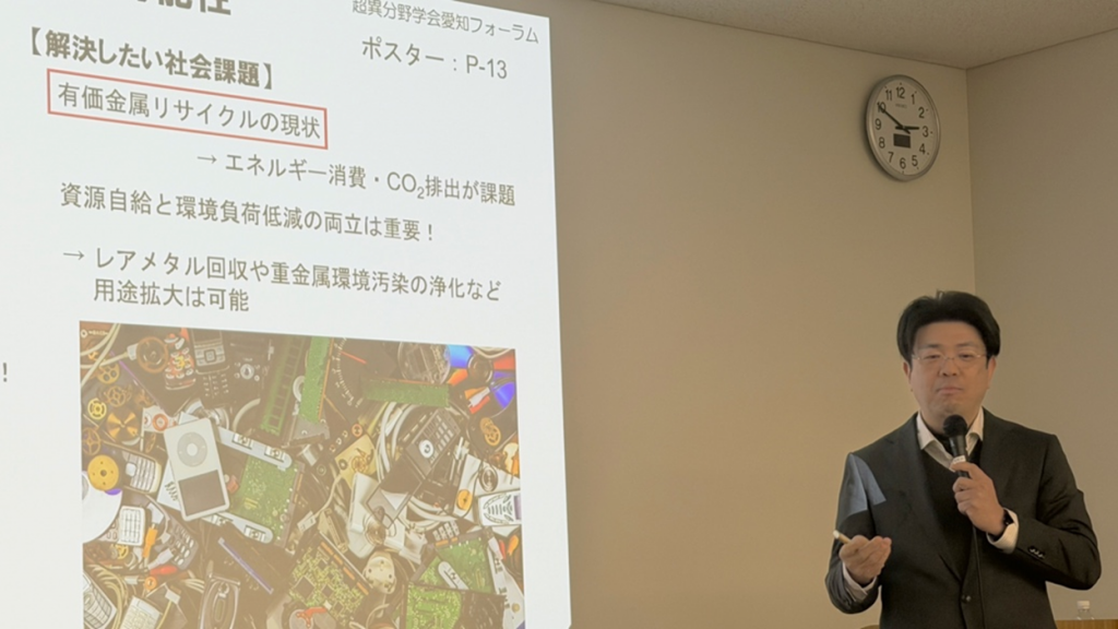 細田教授は、「資源の海外依存や、従来リサイクルに伴うエネルギー多消費・環境負荷といった社会課題の解決を目指し、金属と電子をやり取りできる微生物を『生きる化学工場』と捉えて、持続可能な資源循環社会の実現を志している。研究室レベルの知見を産業化(実装)へ移すため、パートナーシップ(クロスオーバー)を求めている」と語りました。