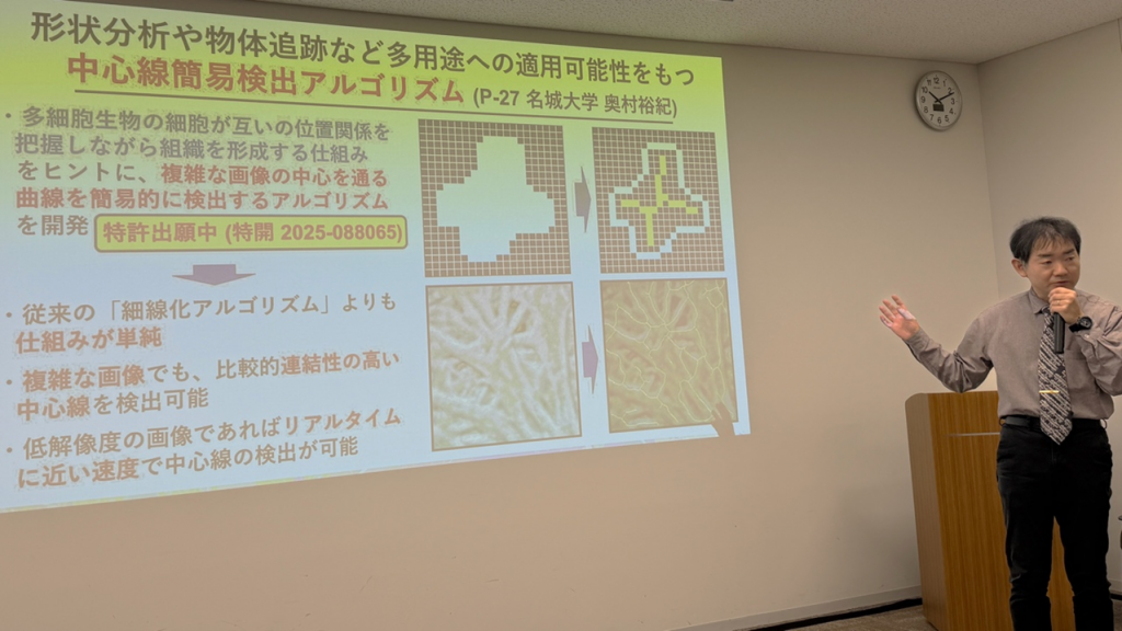 奥村教授は、「形状分析や物体追跡など多用途への適用可能性をもつ中心線簡易検出アルゴリズム」のテーマでピッチ (簡潔な短時間のプレゼン) を行い、農学の生命科学分野の研究にたずさわる中で、「多細胞生物の細胞が互いの位置関係を把握しながら組織を作る仕組みから、複雑な画像の“中心を通る曲線(中心線)”を簡単な手順で抽出できる数理アルゴリズムの着想を得た。研究や産業の現場で活用できる具体的な応用先・連携先を幅広く探索している」と語りました。
