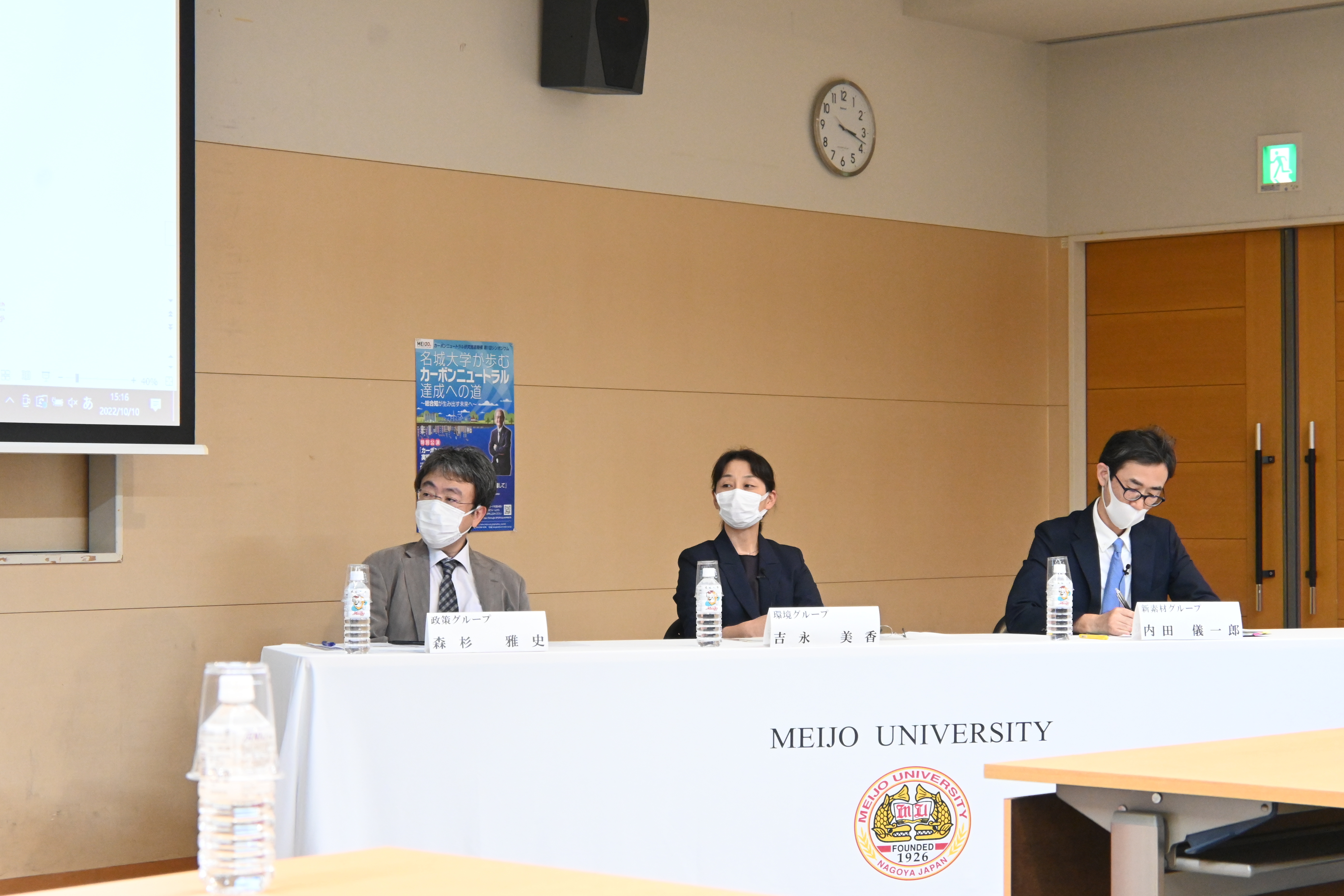 また、平松機構長は「名城大学においてカーボンニュートラル関連の研究テーマをまとめたところ、本学には様々な研究が存在することを把握できたので、当機構ではこれらのテーマを大きく政策・環境・新素材の3つのグループに分け、情報共有をしながら総合知をもってブレイク・スルーを目指すことになった。本日のパネリストの先生方をそれぞれのグループリーダーとして、活動を始めたところである」と述べ、各グループの紹介に移りました。
