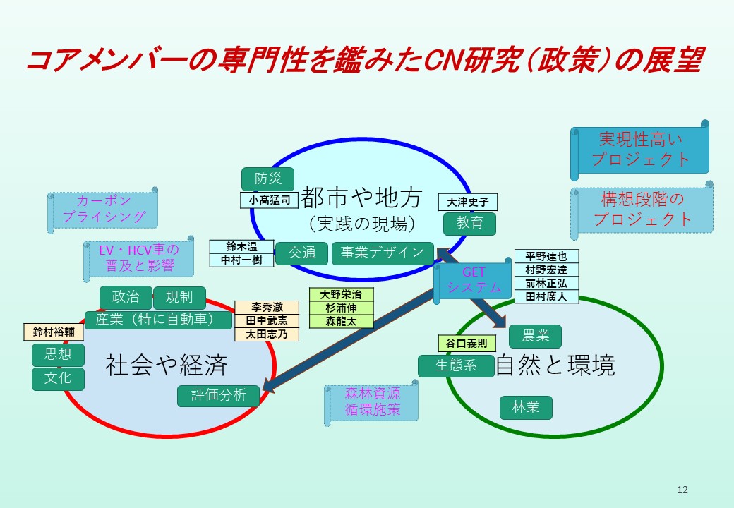 【吉野名誉顧問】行政を含めてカーボンニュートラルを実現しなくてはならないという認識はもう十分すぎるほどある。でも具体的な知恵がない。彼らを動かすためには知恵をあげればよい。それが産官学の切り口だと思う。本学の立場に立ってどういう切り口で入っていけばよいか。入口は2つある。1つ目は『技術』。研究活動によって新しい技術の芽を作ってそれが実れば、これだけ地球環境に貢献しますよ、いかがでしょうか、と投げかけること。そしてもう1つは『裏口』。つまり、社会システム・経済システムから入っていくやり方。我々が議論したら、こんな社会システムのプランが出てきましたよ、というのも1つの切り口。もちろん、実績にするためにはそれを裏付ける技術も必要である。企業なり本学の自然科学分野の研究者と一緒に進めていけばよい。2つの切り口が存在するということを理解すべきだと思う