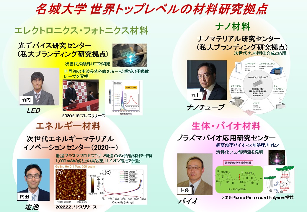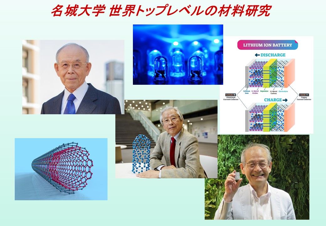新素材グループは、内田儀一郎理工学部教授をリーダーとして、青色LEDを発明しノーベル物理学賞を受賞した故 赤﨑勇特別栄誉教授の研究グループ、カーボンナノチューブを発見した飯島澄男終身教授の研究グループ、そして、本日ご講演いただいたリチウムイオン二次電池の発明でノーベル化学賞を受賞した吉野彰名誉顧問の研究グループといった、世界トップレベルの材料研究が中心となっています。